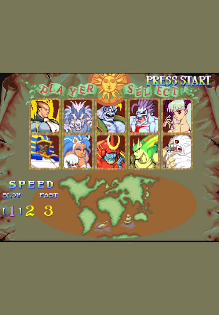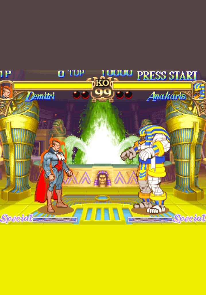 - Fluid Animation: Using the CPS2’s 32-bit color depth, Capcom created massive character sprites with unique animations for specific types of damage (e.g., being sliced in half, frozen, or burned).