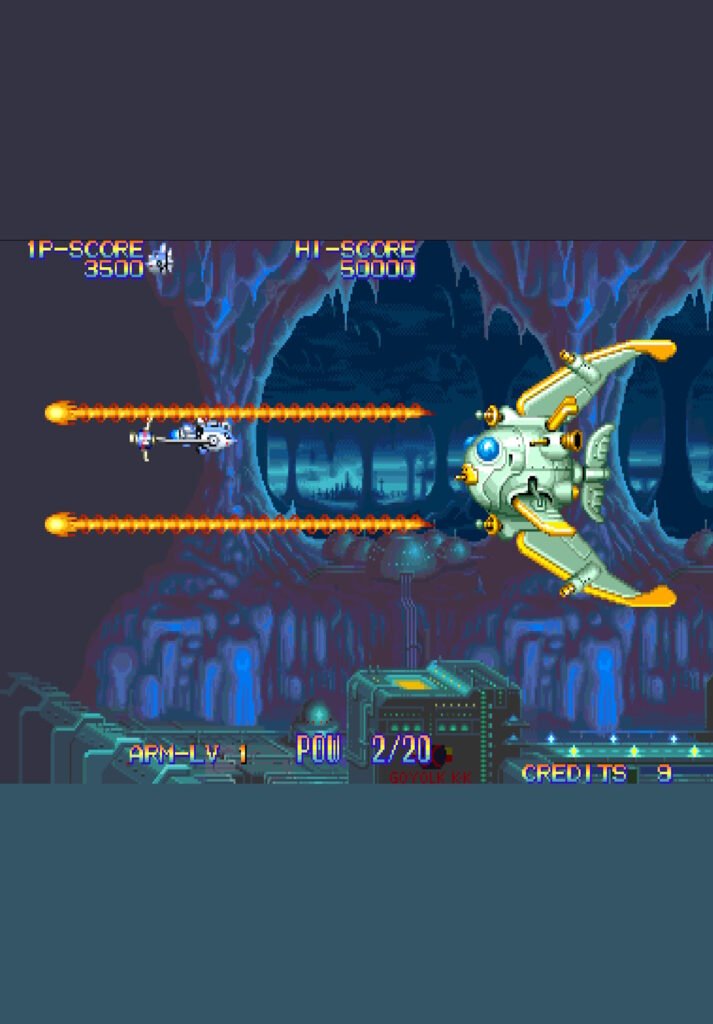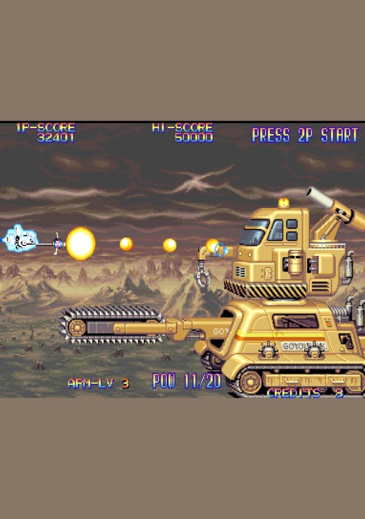 - Power-ups: Weapons can be upgraded through five levels by collecting gems. Additionally, the ship can fire sub-weapons like a Vulcan cannon, bombs, or homing shots.
