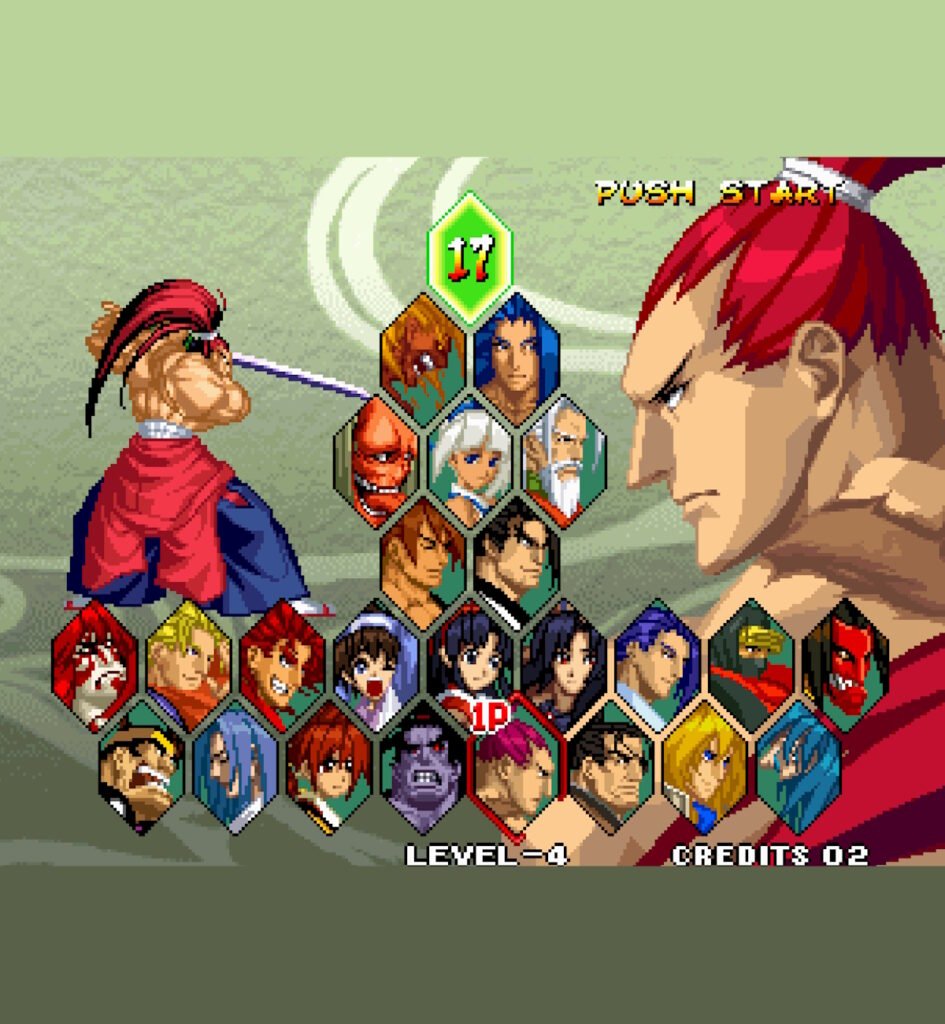 • Haohmaru, Nakoruru, Hanzo Hattori, Galford, Ukyo Tachibana, Kyoshiro Senryo, Genjuro Kibagami, Basara, Shizumaru Hisame, Gaira Caffeine, Jubei Yagyu, Charlotte, Tam Tam, Kazuki Kazama, Sogetsu Kazama, and Rimururu.