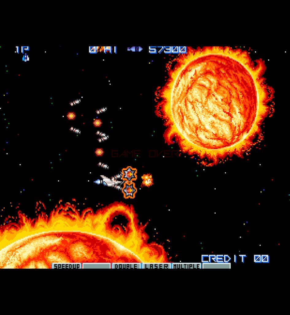 Difficulty: The game is noted for its high difficulty, particularly the “Gradius recovery” problem where losing all power-ups after a death makes subsequent progress extremely challenging.
