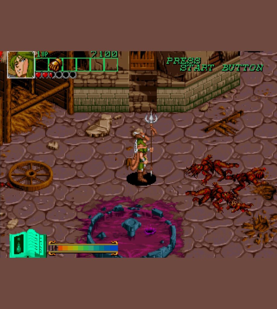 • Magic System: A rotating spellbook at the bottom of the screen allows players to cast spells when a meter is full. Spells can transform the player into powerful forms like a tornado or a rock. Timing is critical; missing the window can result in a useless transformation, such as becoming a pig.